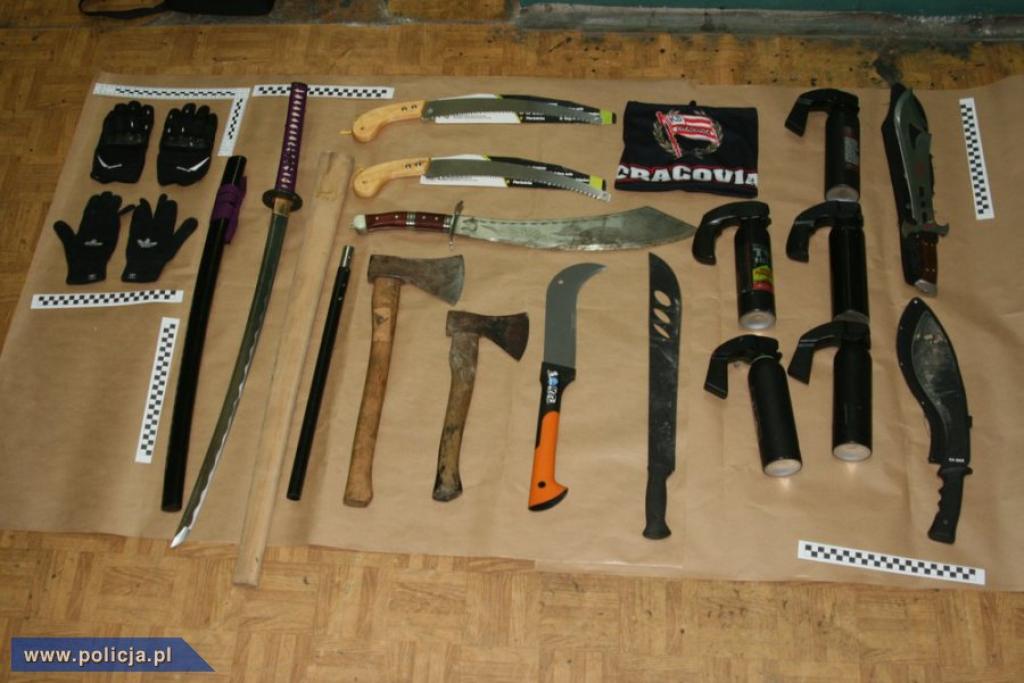 Policjanci ujawnili niebezpieczne narzędzia, które były przewożone przez pseudokibiców jednej z krakowskich drużyn w kilku samochodach. Zabezpieczono m.in. maczety, siekiery, miecz samurajski i bagnet. Wszystko wskazuje na to, że tak uzbrojeni wybierali się na mecz do Wrocławia.